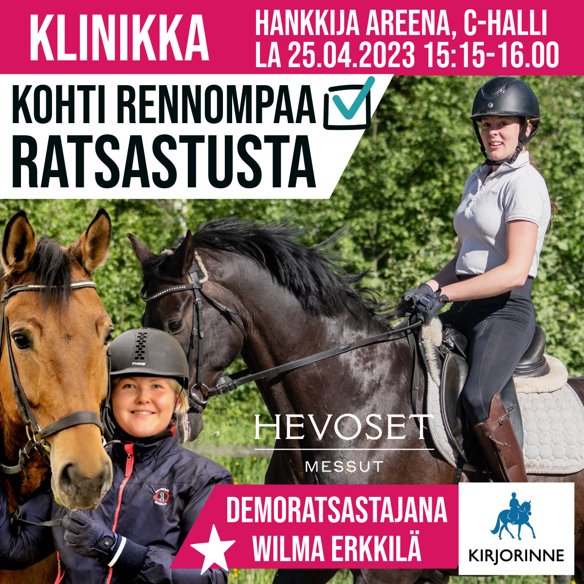 Looginen perusratsastus luo vahvan pohjan myös ratsukon onnistumiselle jännittävissä esiintymistilanteissa, ja saat klinikalta myös kokeneen kilpailijan täsmävinkit rennompaan kisasuoritukseen.