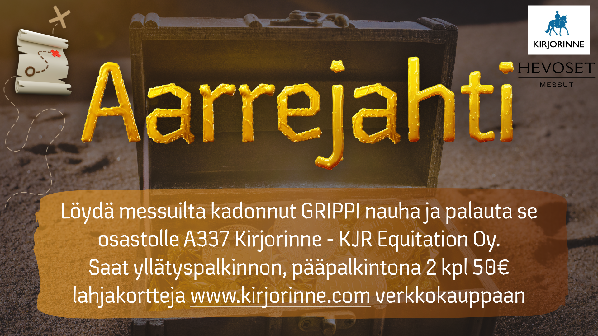 Hevoset messujen ajan on käynnissä launtaina ja sunnuntaina sekä messukisa, että aarrejahti! Löytäjille luvassa mukavia palkintoja. Jos löydät eksyneen GRIPPI nauhan, palauta se osastolle A337.